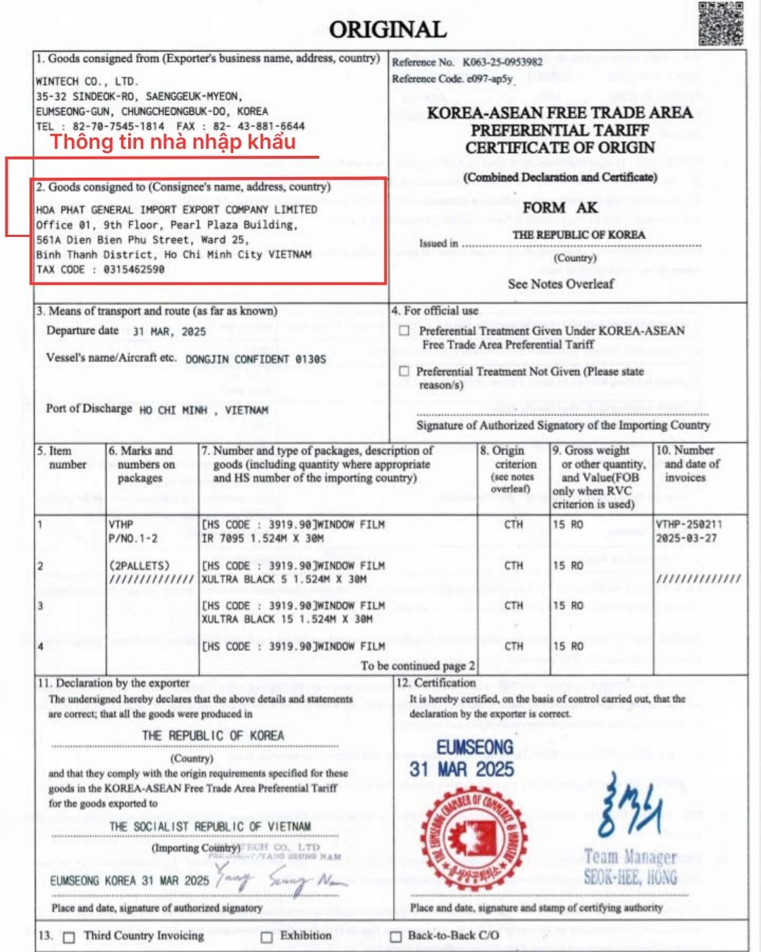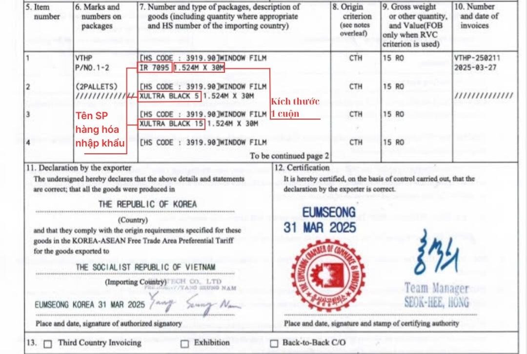 👉 Nguyên tắc: Nhà xuất khẩu trên CO phải khớp với thương hiệu sản phẩm bạn mua.