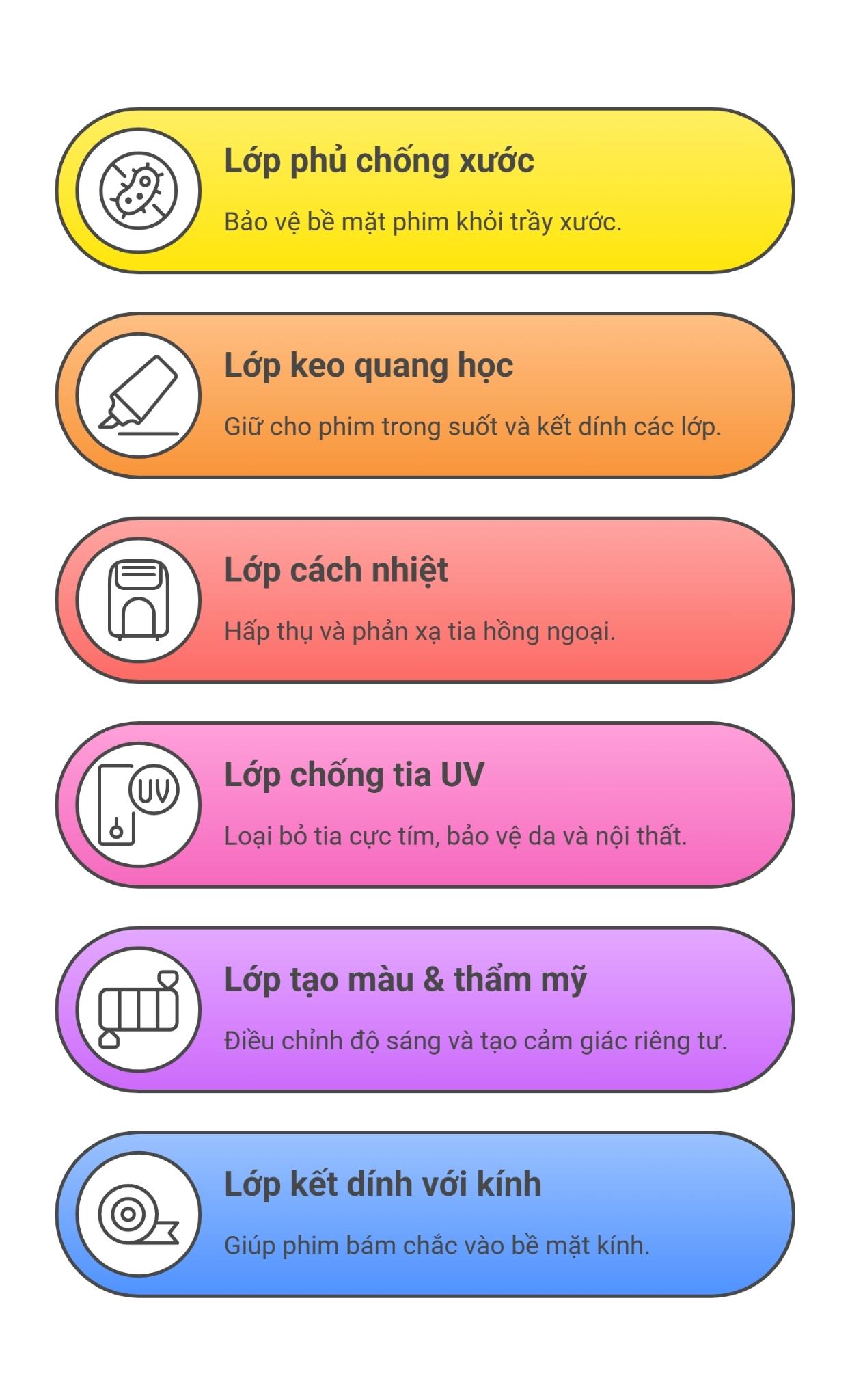 Để tạo ra một tấm phim cách nhiệt chất lượng, các hãng sản xuất thường sử dụng 3–7 lớp vật liệu được ép chặt với nhau bằng công nghệ hiện đại. Mỗi lớp đảm nhận một vai trò riêng, bổ sung cho nhau để đạt hiệu quả tối ưu: