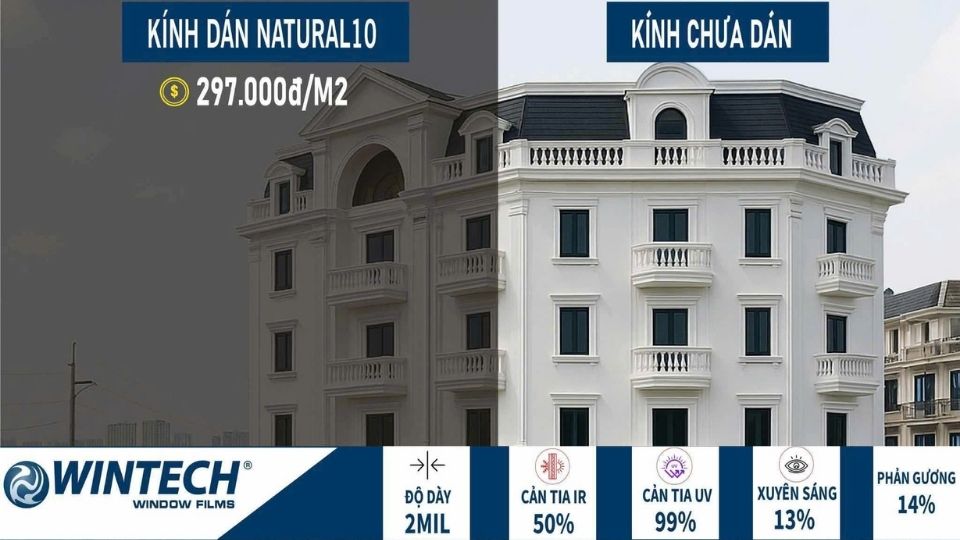 Phim cách nhiệt Natural 10 Wintech được thiết kế cho những không gian ưu tiên độ kín đáo và riêng tư, hạn chế ánh sáng mạnh và giảm chói hiệu quả, trong khi vẫn giữ bề mặt kính tự nhiên, không phản gương.