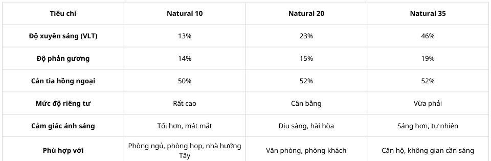 👉 Nếu bạn cần kín & riêng tư tuyệt đối, hãy chọn Natural 10. Còn nếu muốn giữ sáng tự nhiên hơn, có thể chọn Natural 20 hoặc Natural 35 trong cùng dòng Carbon.