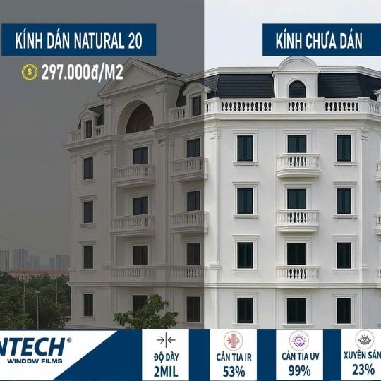Với độ truyền sáng trung bình, Natural 20 giúp không gian dịu ánh sáng hơn, giảm cảm giác nắng gắt, đồng thời vẫn giữ được tầm nhìn xuyên kính tự nhiên và thẩm mỹ kính hài hòa. Bề mặt phim không tạo hiệu ứng gương, không gây chói cho môi trường xung quanh hay công trình đối diện