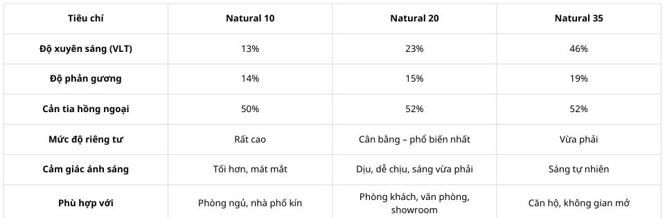 Natural 20 là lựa chọn “dễ dùng nhất” trong dòng Natural, phù hợp cho các không gian cần ánh sáng dịu, riêng tư vừa phải và thẩm mỹ kính tự nhiên.