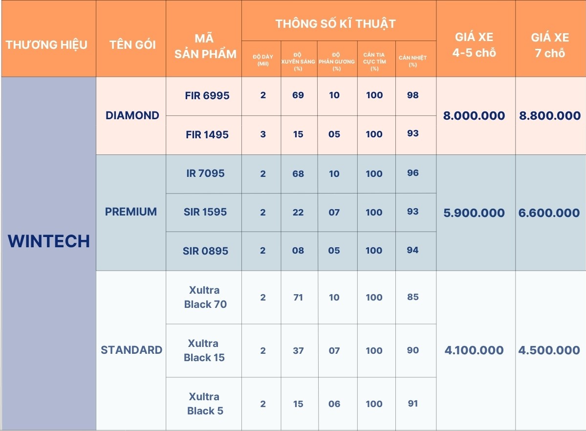 🔬 Bảng Báo Giá 3 Gói Phim Cách Nhiệt Ô Tô Wintech