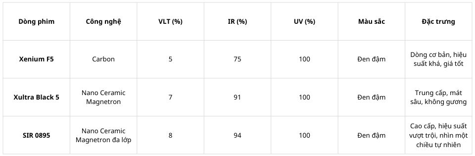 Để giúp khách hàng dễ dàng lựa chọn đúng nhu cầu, dưới đây là bảng so sánh 3 dòng phim đen đậm phổ biến nhất trong hệ sinh thái Wintech. Trong đó, phim cách nhiệt SIR 0895 thuộc nhóm cao cấp nhất, vượt trội về mát sâu – độ riêng tư – độ bền – thẩm mỹ đen đậm.