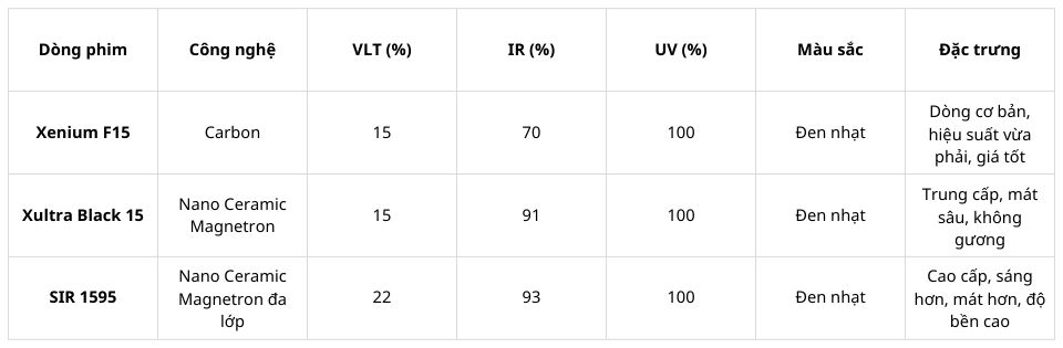 Để giúp khách hàng dễ quyết định hơn, dưới đây là bảng so sánh 3 dòng phim phổ biến cùng phân khúc. Phim cách nhiệt SIR 1595 thuộc nhóm cao cấp, nổi bật với độ sáng hài hòa nhưng cách nhiệt mạnh hơn các dòng phim sáng thông thường.