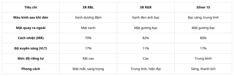 👉 SR RBL – nổi bật và riêng tư hơn, SR RGR – cân bằng và dễ dùng, Silver 15 – mạnh nhất về phản quang và hiệu suất.