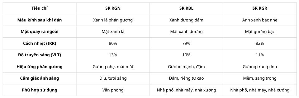 Cả SR RGN, SR RBL và SR RGR đều thuộc nhóm phim phản quang Wintech, có khả năng giảm nhiệt, giảm chói và tăng riêng tư ban ngày. Điểm khác biệt nằm ở màu phản quang, mức độ gương và cảm giác thẩm mỹ.