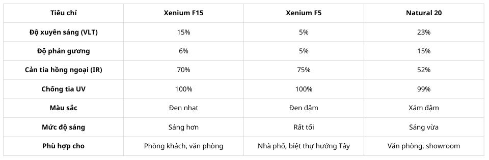 Xenium F15 phù hợp cho những ai cần một giải pháp cách nhiệt đủ hiệu quả để cải thiện cảm giác nóng so với kính trần, nhưng vẫn muốn giữ không gian sáng, dễ chịu và chi phí ở mức hợp lý cho sử dụng hằng ngày.