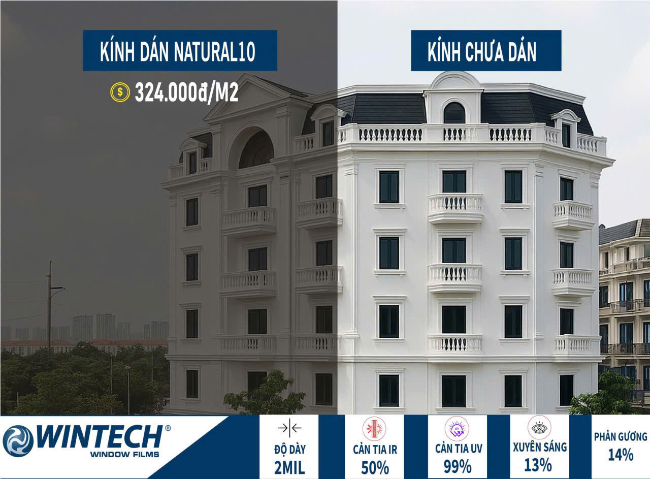 Phim cách nhiệt Natural 10 Wintech được thiết kế cho những không gian ưu tiên độ kín đáo và riêng tư, hạn chế ánh sáng mạnh và giảm chói hiệu quả, trong khi vẫn giữ bề mặt kính tự nhiên, không phản gương.
