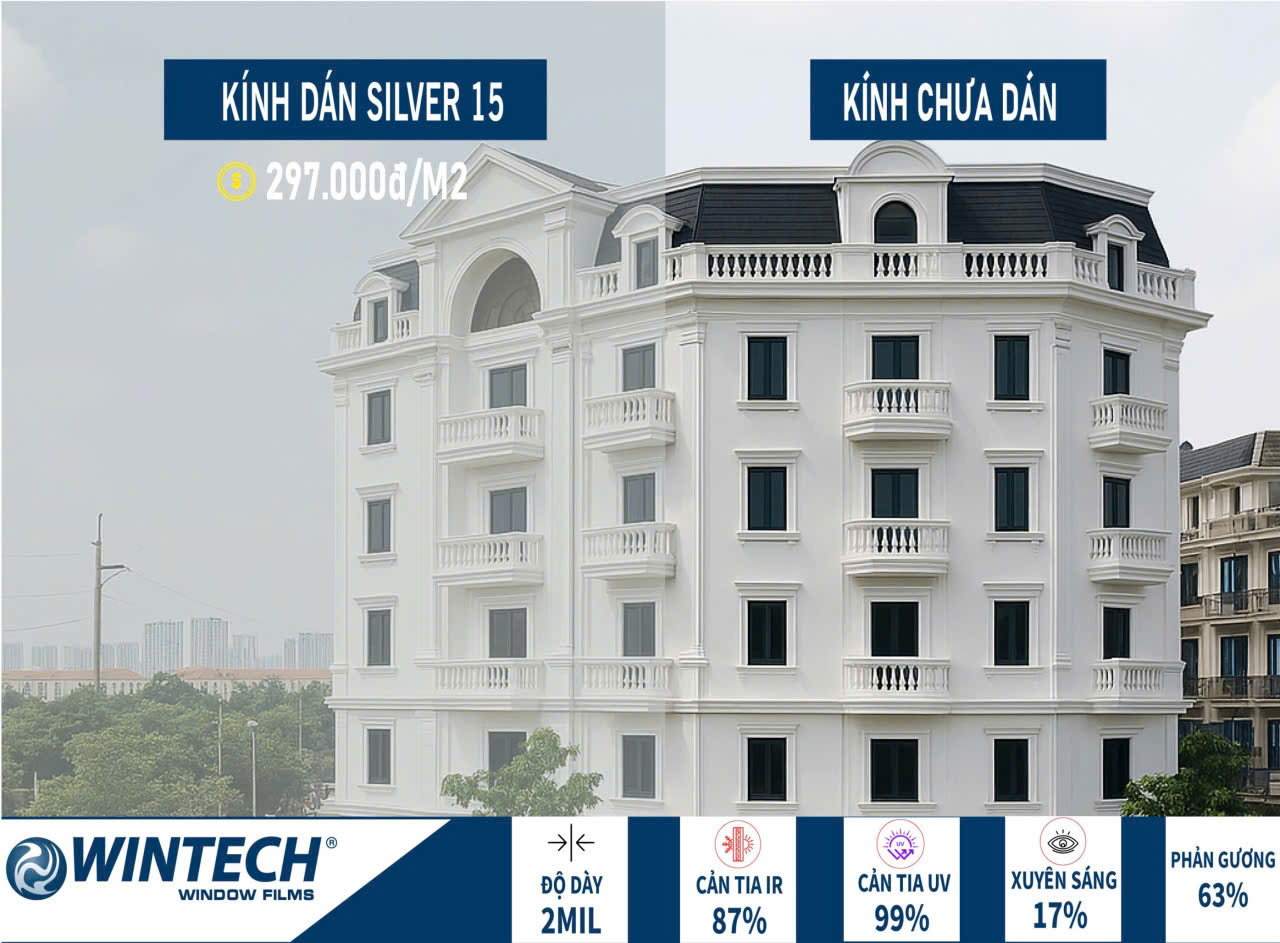 Phim cách nhiệt Silver 15 Wintech là dòng phim phản quang bạc, được thiết kế để giảm nóng mạnh, tăng riêng tư ban ngày và tạo hiệu ứng gương cho mặt tiền kính. Việc hiểu rõ ưu – nhược điểm giúp lựa chọn đúng và tránh nhầm lẫn với các dòng phim không phản quang.